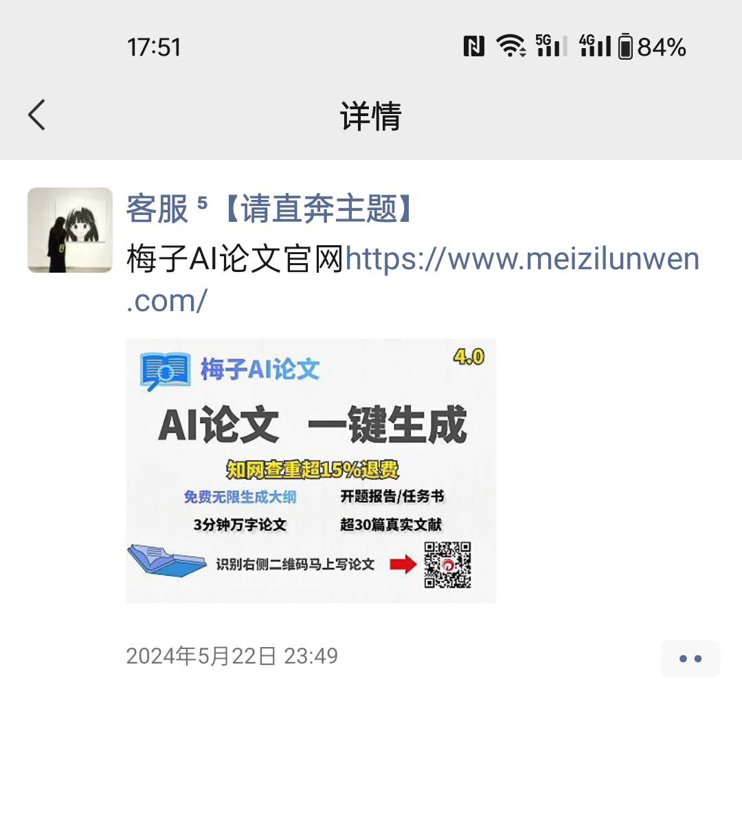 转发或发布梅子AI论文网相关视频或者图片(视频内容30秒以上,图片内容无限制),题目为“梅子AI论文-高质量论文写作平台”,带入ai写作、大学生、论文初稿话题、毕业论文四个话题。播放量只需要过1000。截图和账号发给客服,免费领取一篇论文写作额度。